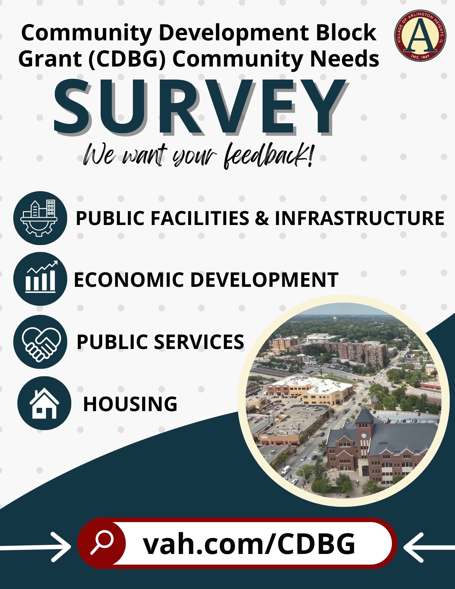 To learn more about the Community Development Block Grant funds and to provide your input, please visit vah.com/cdbg. Your feedback is invaluable and will play a key role in how Arlington Heights evolves to meet the needs of its residents in the coming years.