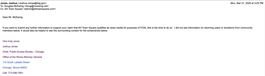 Following the village’s decision not to recognize AH Town Square as a legitimate press entity, a review request was sent to the Illinois Public Access Counselor (IL PAC) office. This initiated a thorough email dialogue between Mr. Douglas McEwing and Mr. Joshua Jones, Chief of the Public Access Bureau. Their discussions focused on transparency and access to information in Arlington Heights.