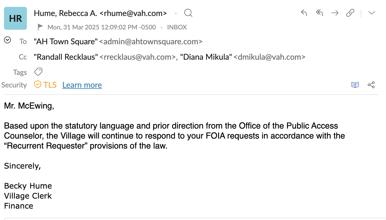 The email also hinted at broader concerns about favoritism in how the Village responds to record requests: “If the Village continues to disregard the legitimate press status of AH Town Square and does not treat its FOIA requests accordingly, legal proceedings are only steps away.” McEwing added that “while you may no longer be serving as Village President soon, that change in role will not shield you from legal accountability.”